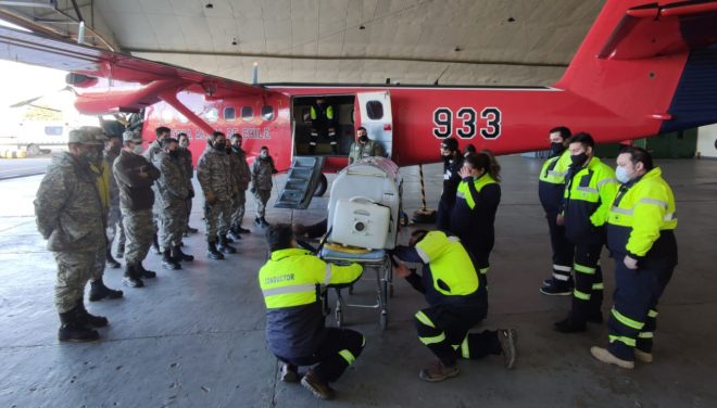 En dependencias de la Base Aérea Chabunco de Punta Arenas, tripulaciones del Grupo de Aviación N°6 de la IVa Brigada Aérea junto al equipo del Servicio de Atención Médica de Urgencias (SAMU), desarrollaron un ejercicio práctico de traslado de paciente Covid-19 en cápsula de aislamiento, en avión DHC-6 Twin Otter y helicóptero Bell -412.